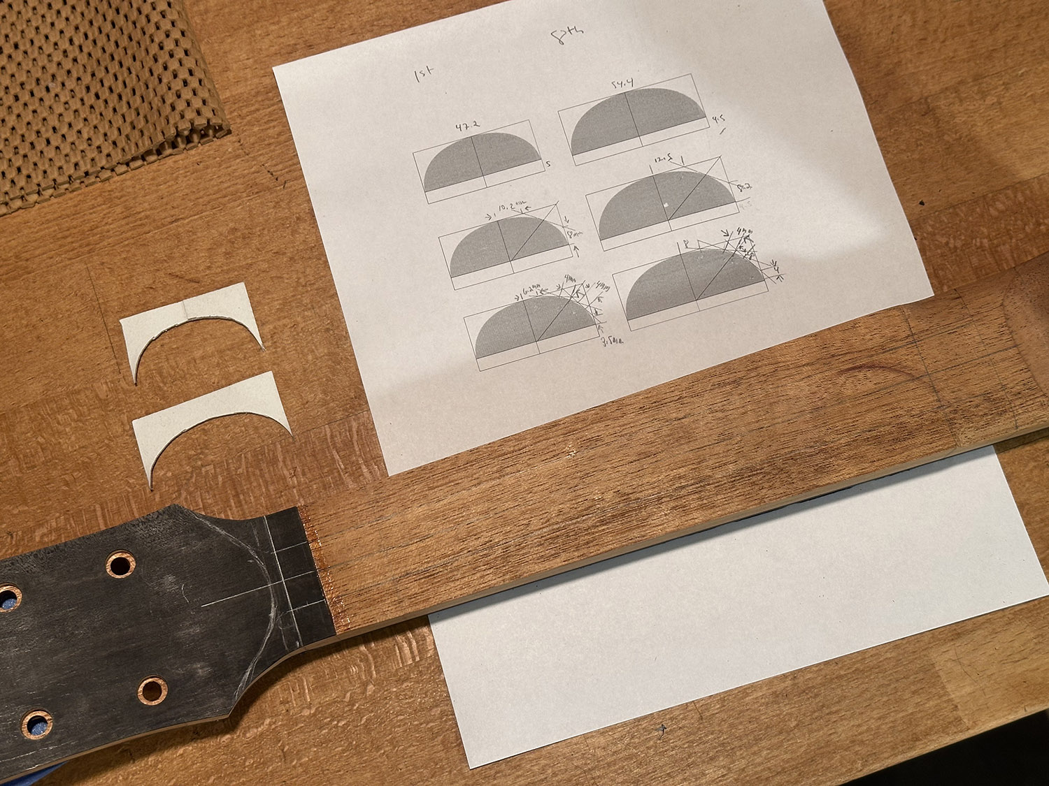 neck profile drawn in photoshop at the first and 8th frets. the measurements shown locate the six flat facets used to rough shape the neck.