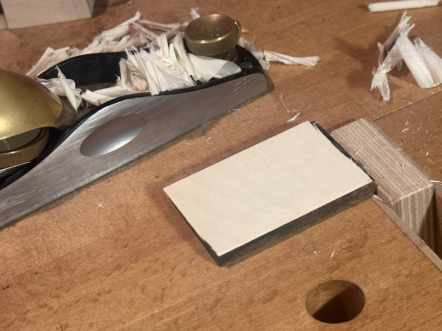 i glued a thin piece of holly to ebony for the heel cap. thicknessing it down to .5mm to match the purfling line.