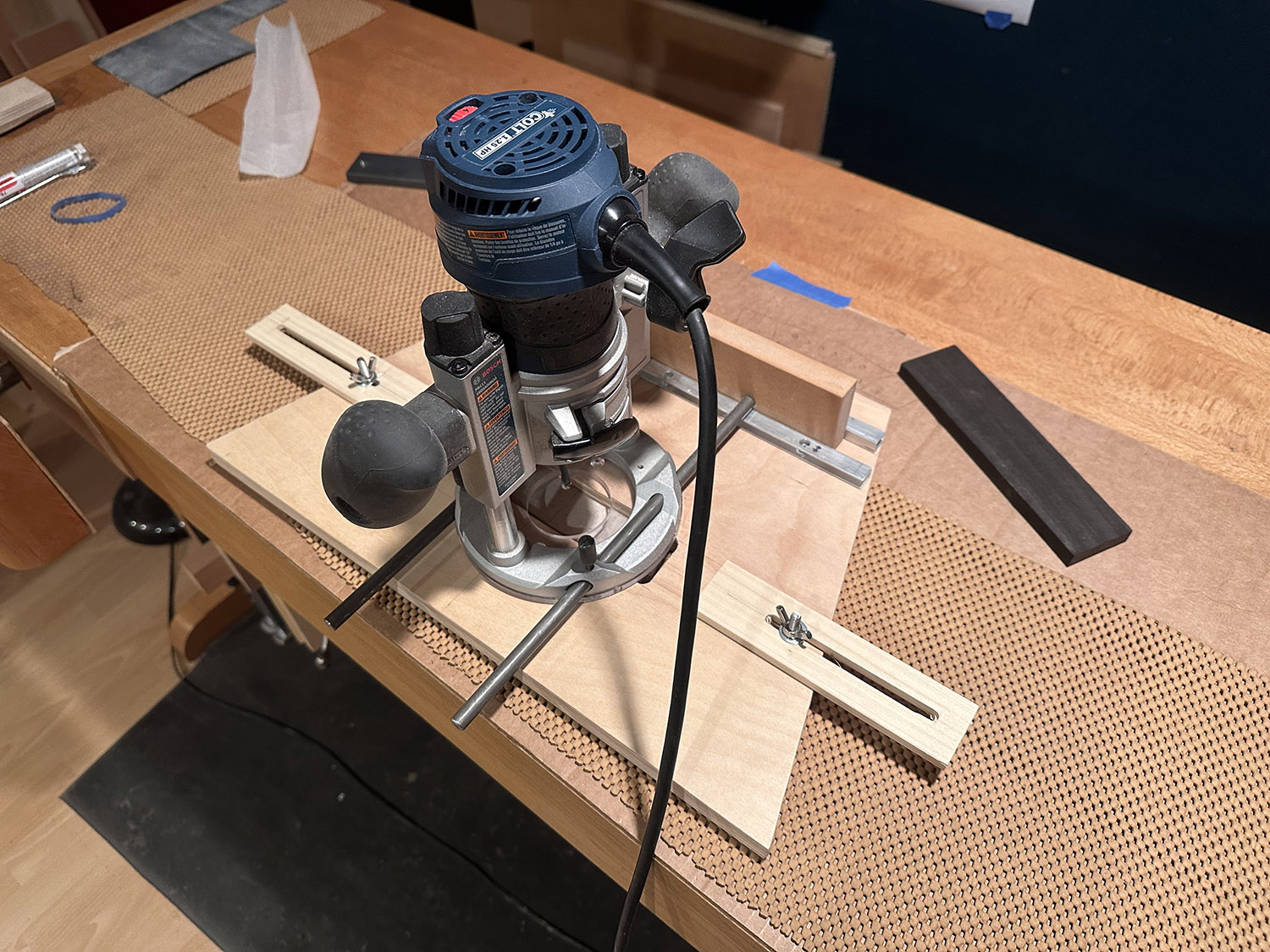 jig for routing the saddle slot in the bridge. gore and gilet designed this jig to be usable off or on the guitar - allowing the saddle to be precisely located after the bridge is glued to the top (i opted to route the slot prior to attaching the bridge).