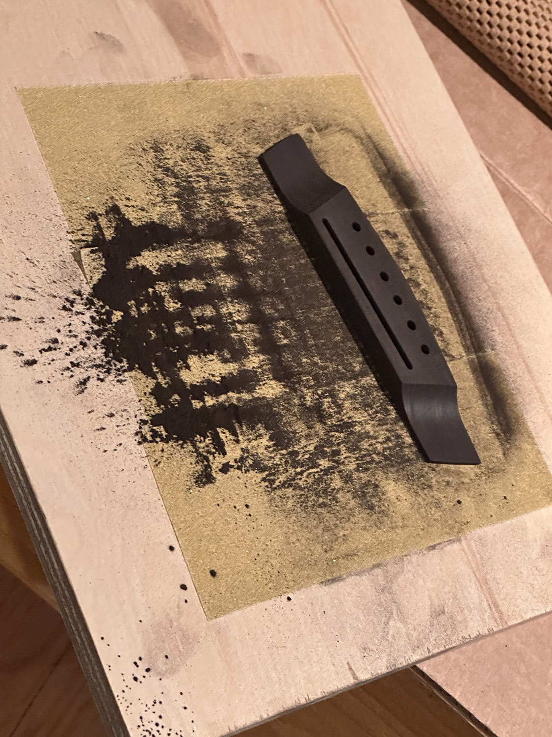 shaping the bottom of the bridge to match the radiused sound board. this radiused sanding board was made from 4 x 1/8" sheets of plywood glued up in the go-bar deck with the radius board as form.