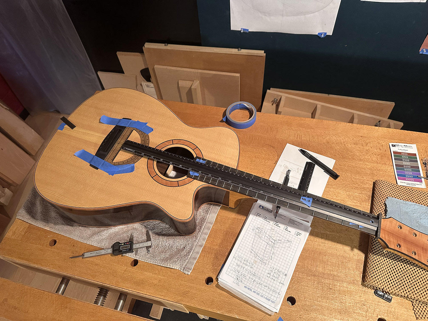 after allowing the finish to cure for about 2 weeks, here i am locating the bridge - based on the scale length plus intonation compensation allowances.