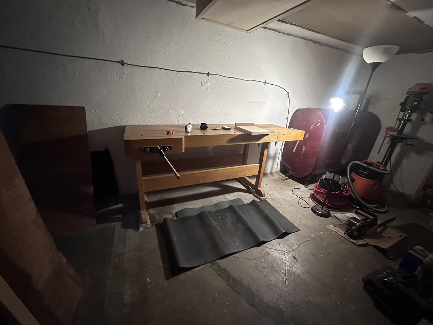 i built this beech workbench about 20 years ago. it has been tucked away next to the oil tank in the basement since moving in 2011. it will be at the heart of the new endaevor. the drill press, shop vac and compressor will also be used; probably not the chainsaw.
